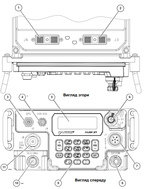 **10Роз’єм антени нижнього діапазону (LB) (J5)Забезпечує підключення антени з опором 50 Ом за допомогою різьбового роз’єму N типу – роз’єм (TNC) для 30,0000 – 512,0000 МГц. Цей роз’єм використовується для передачі сигналів VHF/UHF у прямій видимості (VULOS).