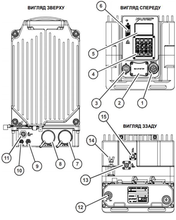 | 24 | Високочастотний роз’єм J3 VHF | Роз’єм BNC для підключення НВЧ антени 50 Ом. ПРИМІТКА: конкретна антена, що використовується, залежить від потреб користувача. |